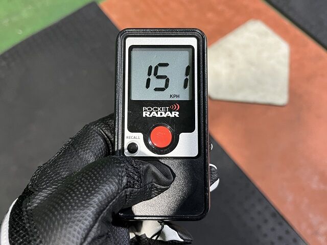 3番打席「145km」の球速を「Pocket Radar」で計測 計測最速値は151KPHの数値が出ました